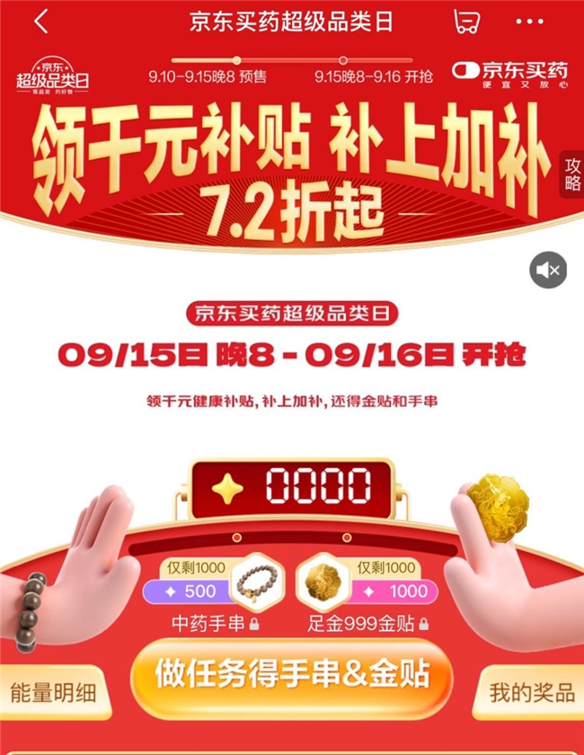 为了满足大家“邪修”养生的需求,京东买药9月15日晚8点-9月16日的超级品类日活动,推出千元健康补贴,以及7.2折起等优惠,健康好物覆盖秋季进补、换季防护、中秋送礼等多场景的健康需求。不仅如此,用户来到活动会场,完成指定任务即可领取金贴与健康手串等惊喜好礼,实现从身体到心理、从产品到体验的全方位进补。