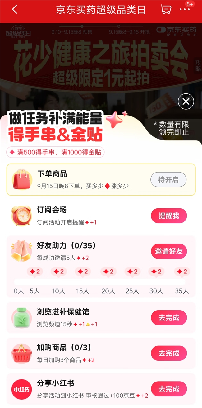 京东买药超级品类日:9月15日晚8点“花少同款健康之旅”1元起拍网络2025-09-16 09:21