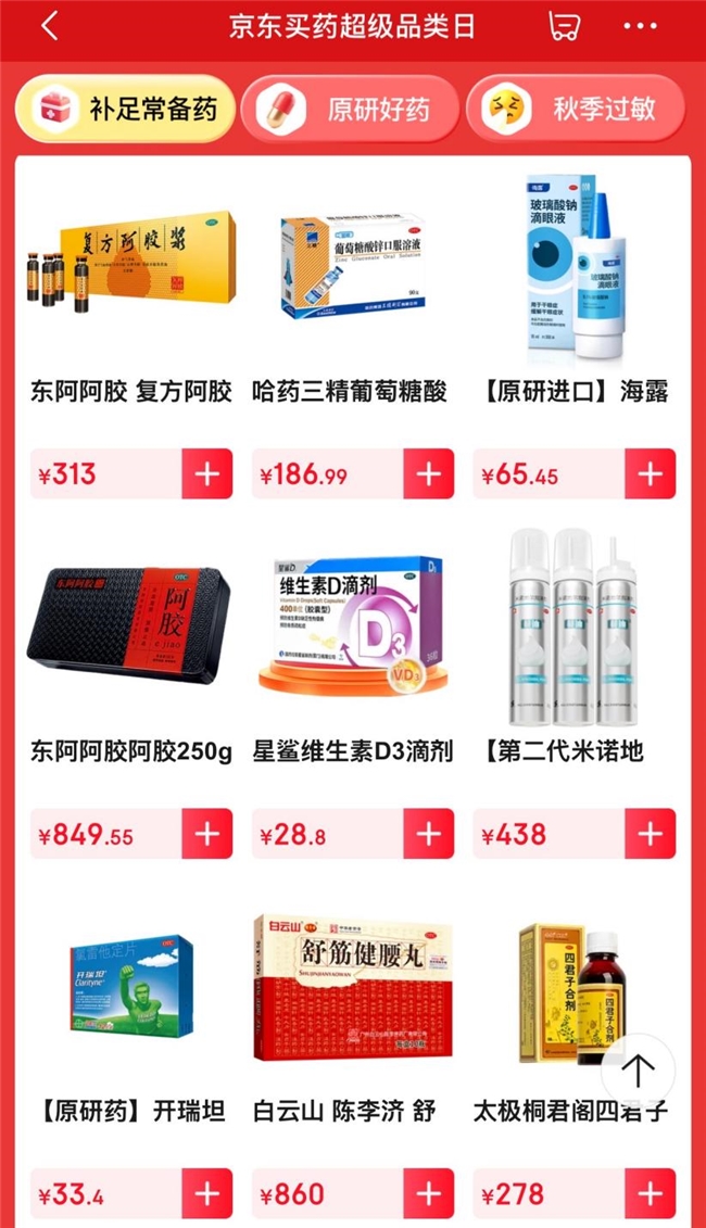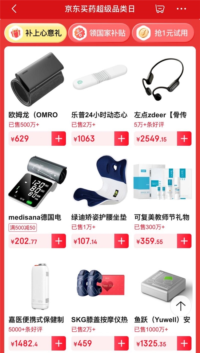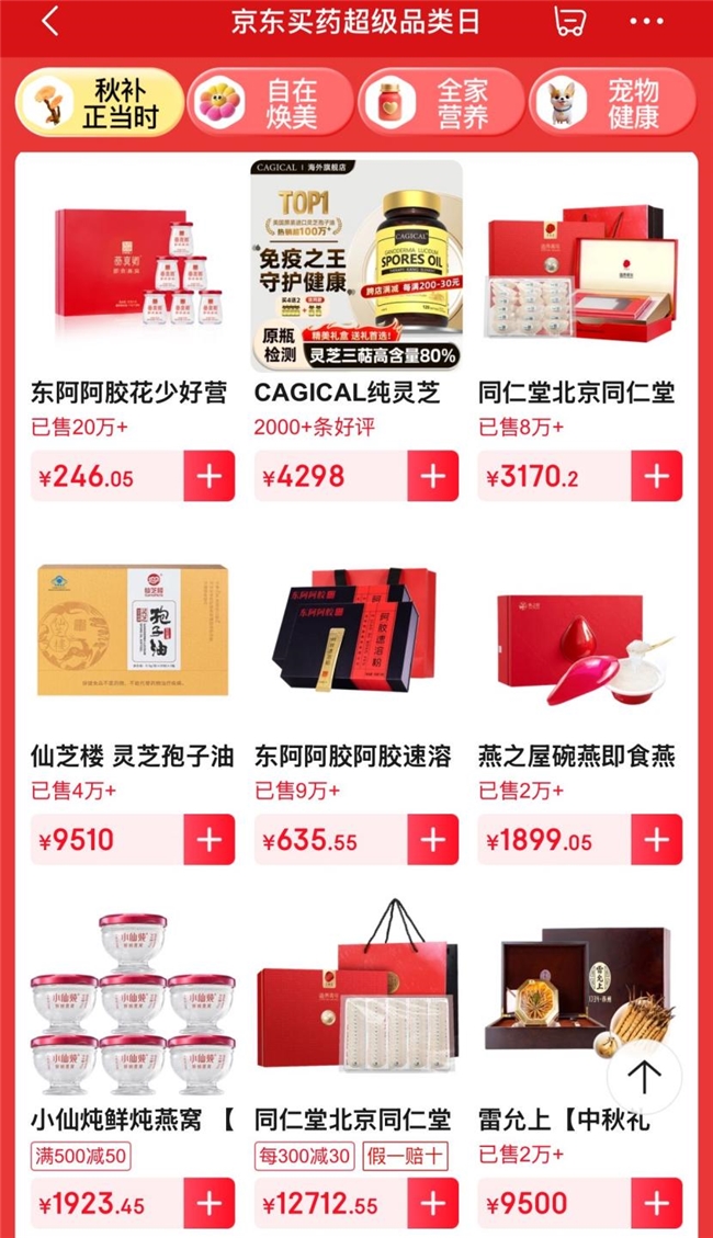 针对熬夜、压力大、体虚畏寒等典型场景,京东买药汇聚燕窝、阿胶、参茸、养生茶饮和灵芝孢子粉等高端滋补品,同时引入辅酶Q10、鱼油、抗氧化胶囊等现代营养制剂,满足年轻人“一边耗一边补”“精准养护”的需求。