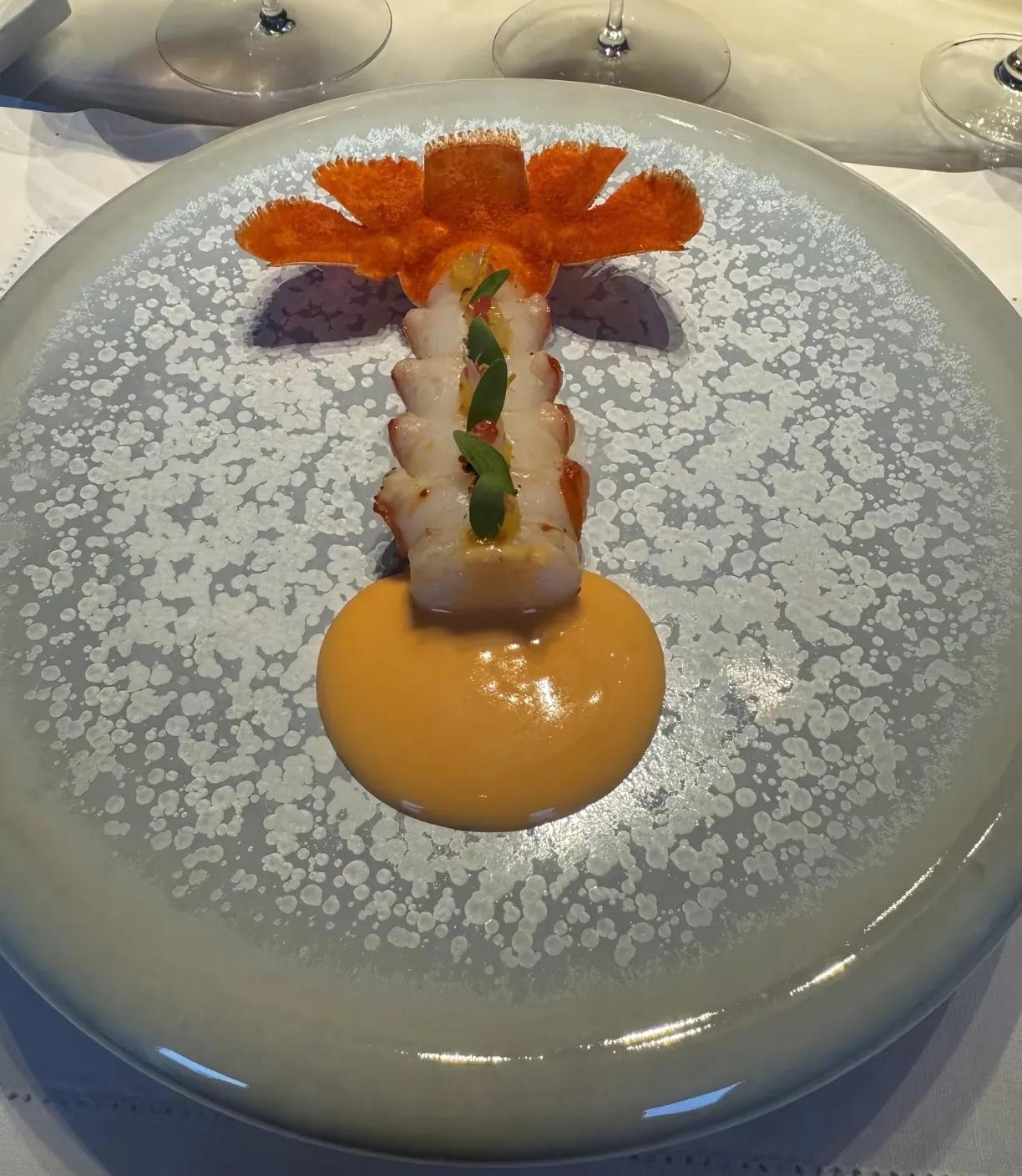 第二张美食照片里,依旧是一个很大的盘子,盘子里只有一只去了头的虾尾,虾尾摆盘很漂亮,挤了蛋黄酱,看着挺有意境的,就是这虾一口一口,量有些太少了。