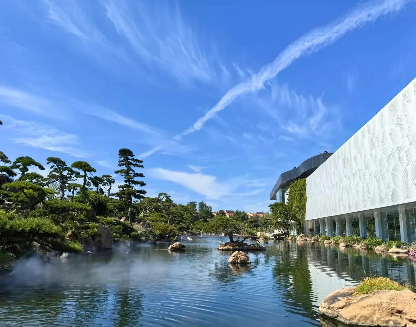 李湘晒出来的照片里,罗红美术馆是真美,清澈的湖面上假山林立,还种了许多黑松,再配上白色的干冰雾,水里还游着白天鹅和黑天鹅,仿佛人间仙境。