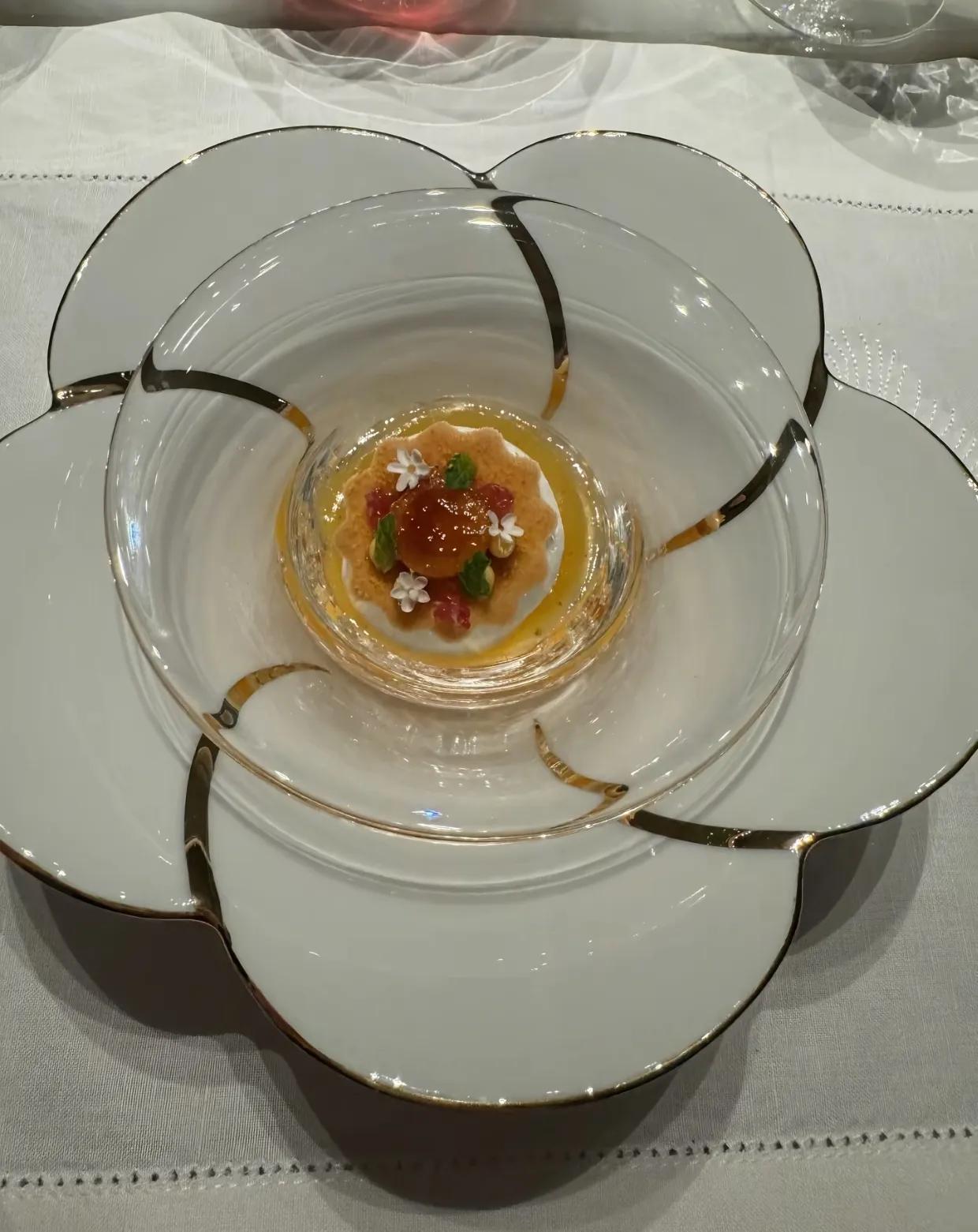 鱼子酱上方是一个红色的雕花,不知道是西红柿还是西瓜,整体看着很精致,吃的话应该还是主要吃鱼子酱。