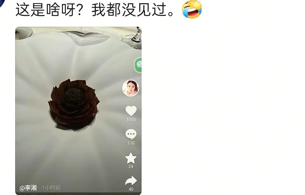 鱼子酱是按照克收费的,李湘这朵花里的鱼子酱少说也得有10克左右,而且看品相黑的都发亮了,应该是顶级的,这么一点至少得几千上万了。